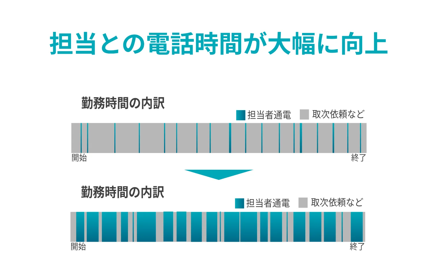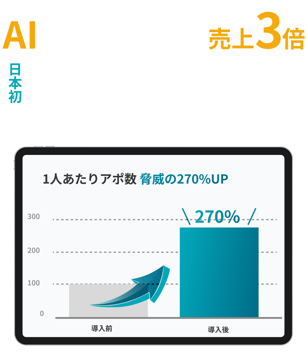 コール量を担保従来は1人の営業が1コールずつ手作業でかけるため、行動量に限界があり、モチベーション管理も大変だったが、AIなら上限なく稼動。 営業体制は変えなくても、営業チーム全体の担当者接触数が3倍&テレアポで疲弊しないから離職率も改善。