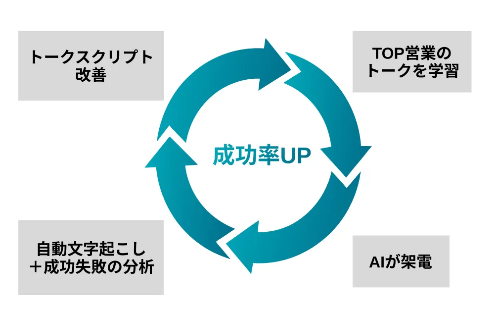 AI学習アルゴリズムAIが行う通話内容を自動でテキスト化し、どのフレーズが成功/失敗に繋がったかをAIが分析。